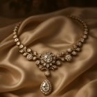An elegant gold necklace adorned with sparkling diamonds and a central sparkling gemstone, beautifully displayed in a luxurious jewelry box.