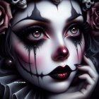 The image features a striking portrait of a woman with bold makeup, including vibrant eyes, dramatic lashes, and glossy lips. She wears a floral headdress and has a captivating, expressive gaze.