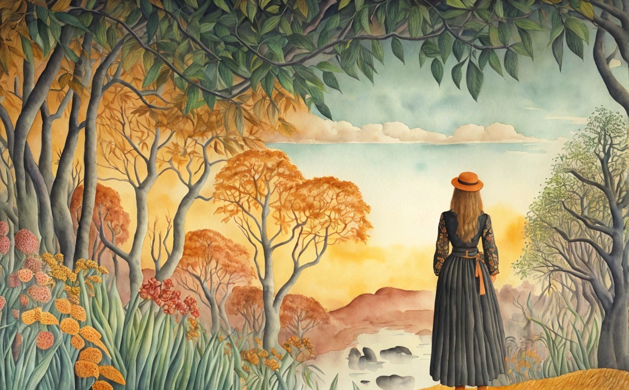 A serene illustration of a woman standing in a contemplative pose amid a stylized, colorful woodland with a setting sun in the background.