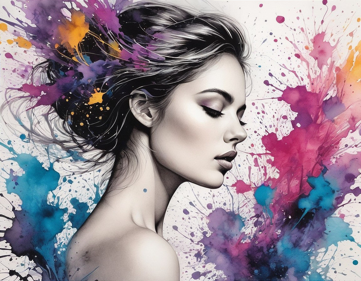 Explore an enchanting illustration featuring ink splatter art. This award-winning piece is elegant, evocative, and magical, with ultra-high definition quality. Hand-colored with litho, crayons, and ink.