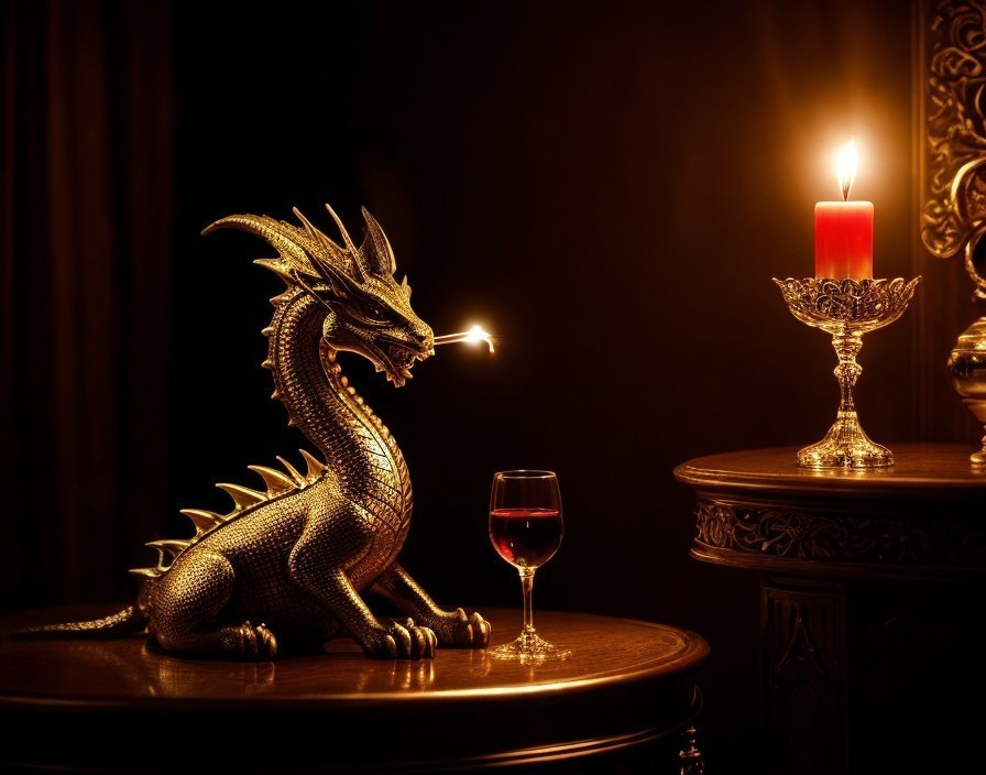 Golden Dragon Sculpture with Wine and Candlelight Setting
