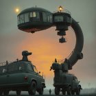 The image features a whimsical paper cutout scene with two cars, one with a dog atop it, under a large banana-shaped structure and a sun, set against a warm, earthy background.