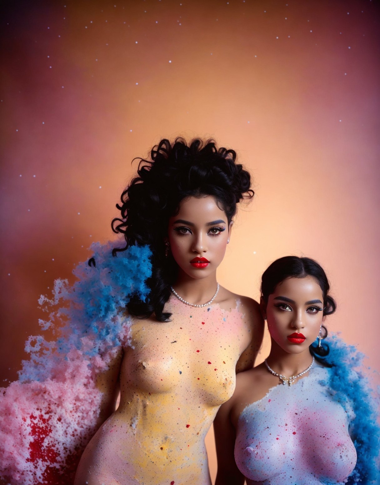 Prompt: "full body shot with ; two sweet Girls in the 1960 with white multi colored paint splattered on their naked bodies, sexy, total body , photographic, surrealist.