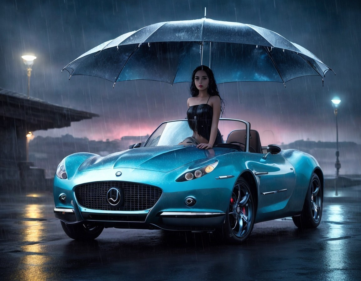 A woman with an umbrella sits atop a blue sports car in the rain at night.
