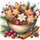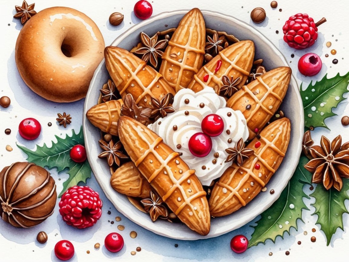 Christmas dessert, a watercolor painting of a plate of waffles with whipped cream and cranberries, surrounded by a donut, raspberries, star anis, chocolate balls, and holly leaves, on a white background with scattered coffee beans.