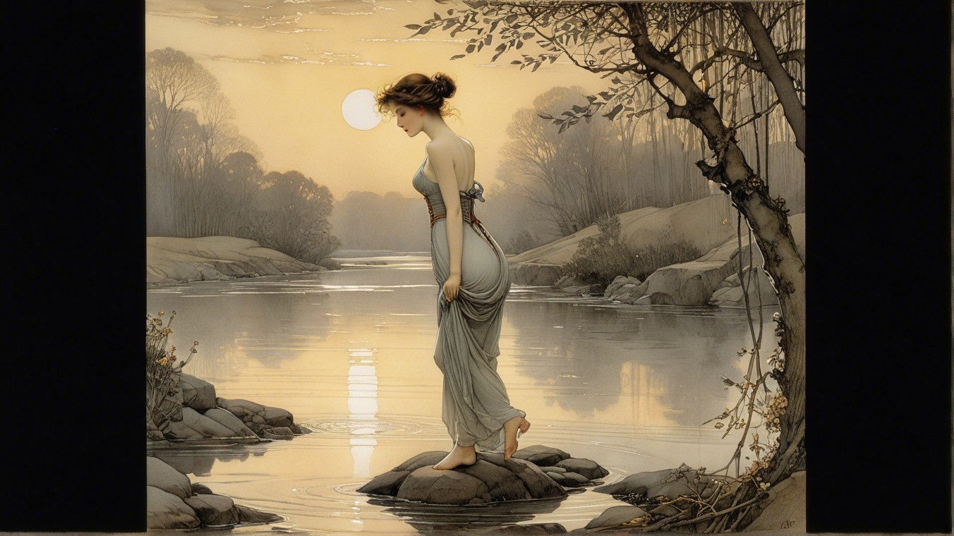 A serene scene of a woman in a flowing white dress wading through calm waters at sunrise. Soft light reflects on the rippling surface, surrounded by trees and gentle autumnal hues.