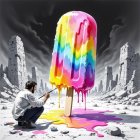 A lone artist sits among ruins, painting a giant, dripping rainbow popsicle. Vibrant colors flow onto the ground, contrasting with the desolate landscape, evoking a surreal blend of joy and decay.