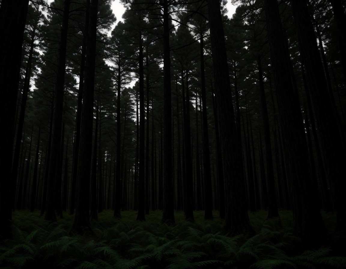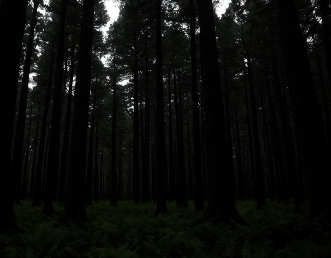 Prompt: pine forest, at the dead of night. The moon struggles to penetrate the thick canopy, leaving the forest in near-complete darkness. The only sources of light are feeble moonbeams that cast long, eerie shadows.