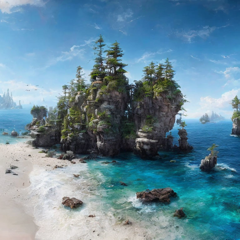 Peaceful fantasy seashore surrounded by giant rocks, with a view of the wide open sea.