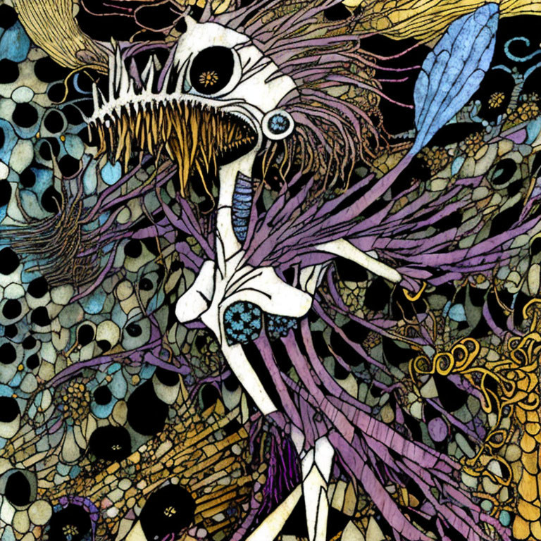 Colorful Abstract Art: Skeletal Bird Creature with Eye & Intricate Patterns