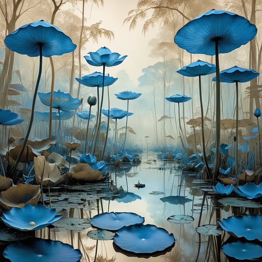A serene landscape features vibrant blue lotus flowers rising majestically above a calm, reflective water surface, surrounded by misty trees and soft, ethereal light.