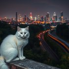 A cute white cat sits on a brick wall, gazing over a city skyline at night. Tall buildings glow with lights, and a train travels along a track in the background, framed by trees.
