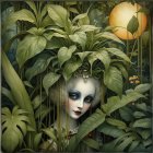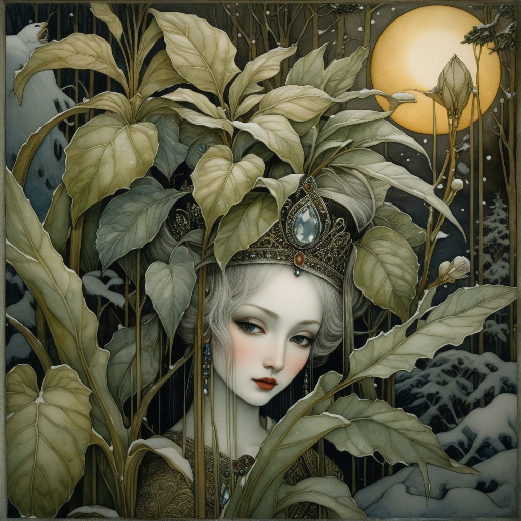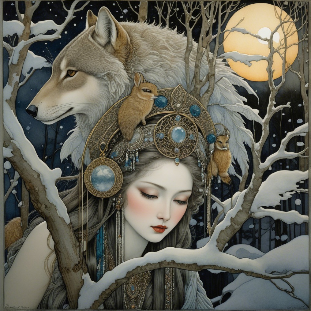 A beautiful woman with flowing hair, adorned in an icy-blue gown and jewels, stands amidst a snowy landscape next to a majestic wolf. The full moon casts a serene glow over the scene.