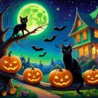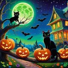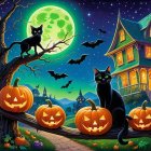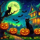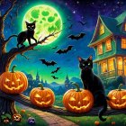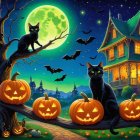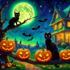 A whimsical Halloween scene features two black cats perched on a tree branch under a glowing full moon. Jack-o'-lanterns line the path, while bats flutter above a spooky, charming house.