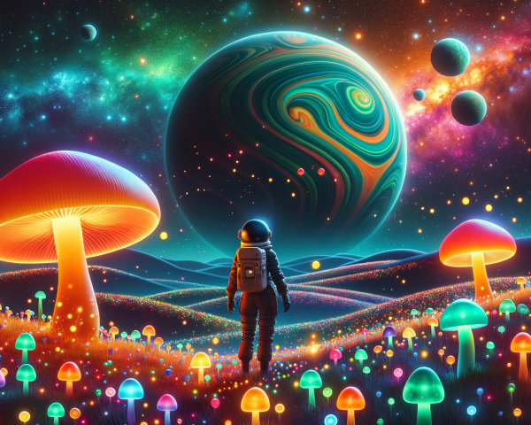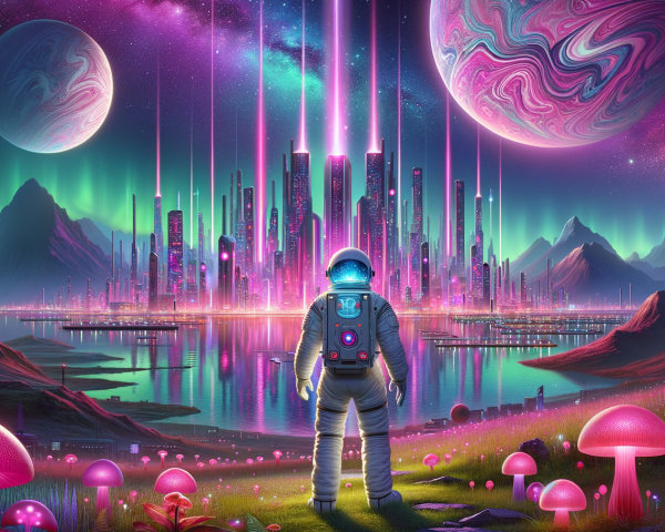 Two futuristic astronauts stand on a sandy alien landscape, wearing sleek, metallic suits with reflective helmets. A dramatic cosmic backdrop features distant planets and stars.