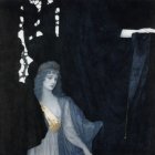 A serene figure with wavy blue hair stands against a dark background, wearing a flowing gown with a golden sash. Delicate patterns suggest a mystical atmosphere, enhancing the ethereal feel.