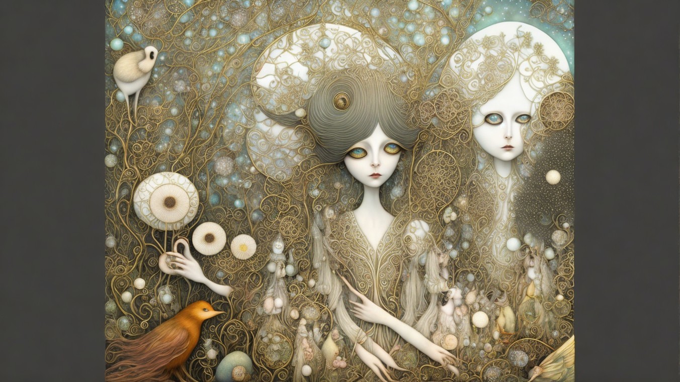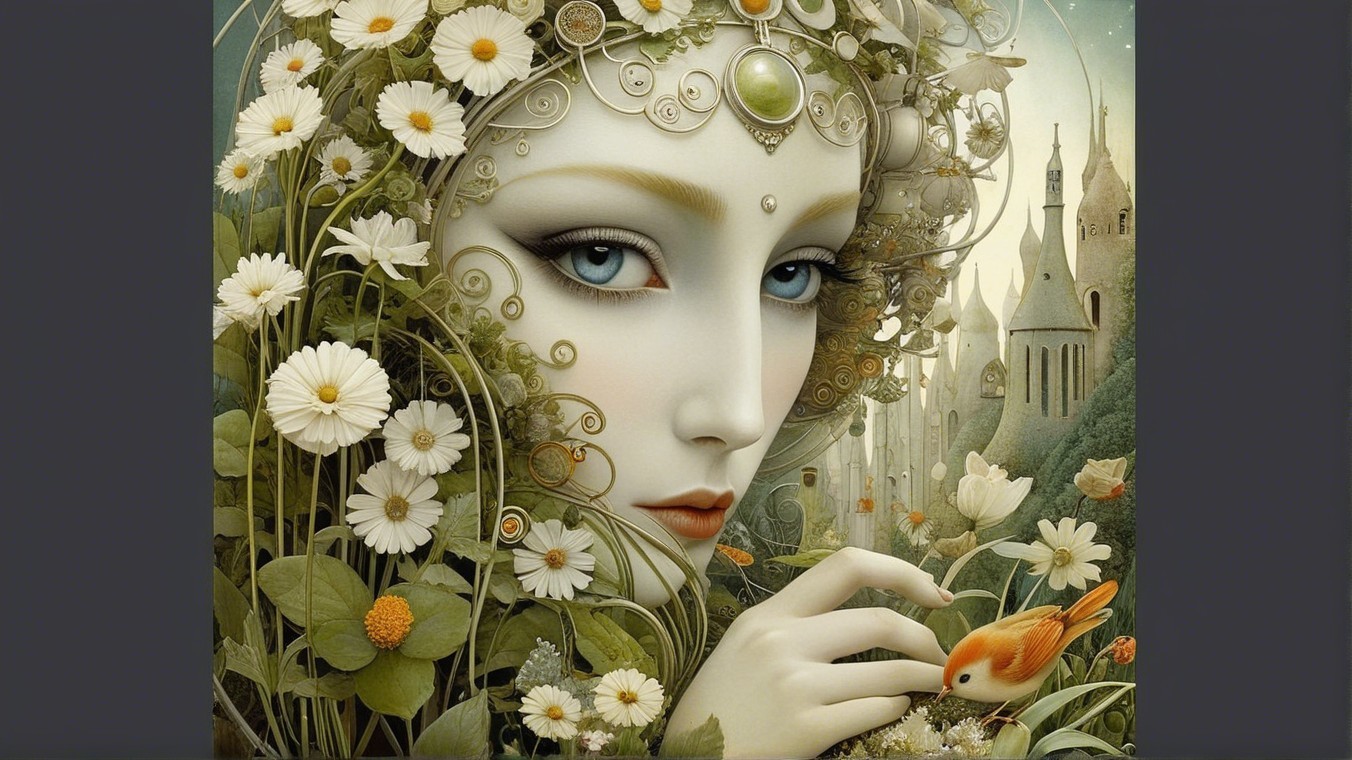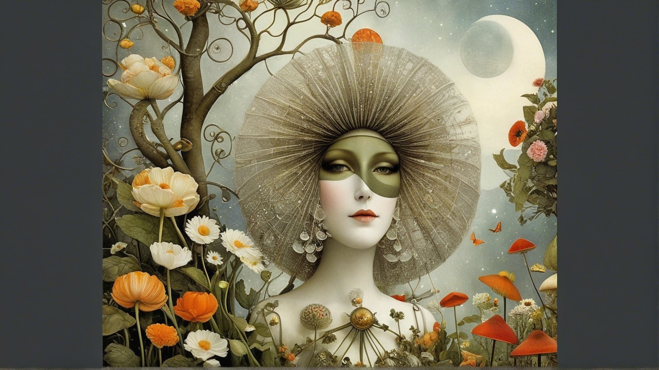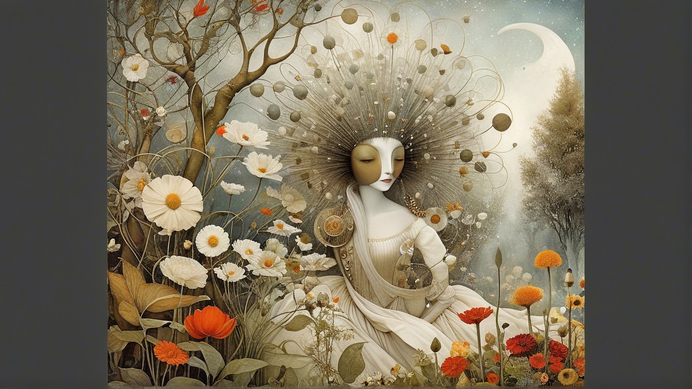 The image features a serene woman adorned with a striking headdress, surrounded by vibrant flowers and soft greenery, under a gentle moonlit sky, exuding an ethereal, dreamlike quality.
