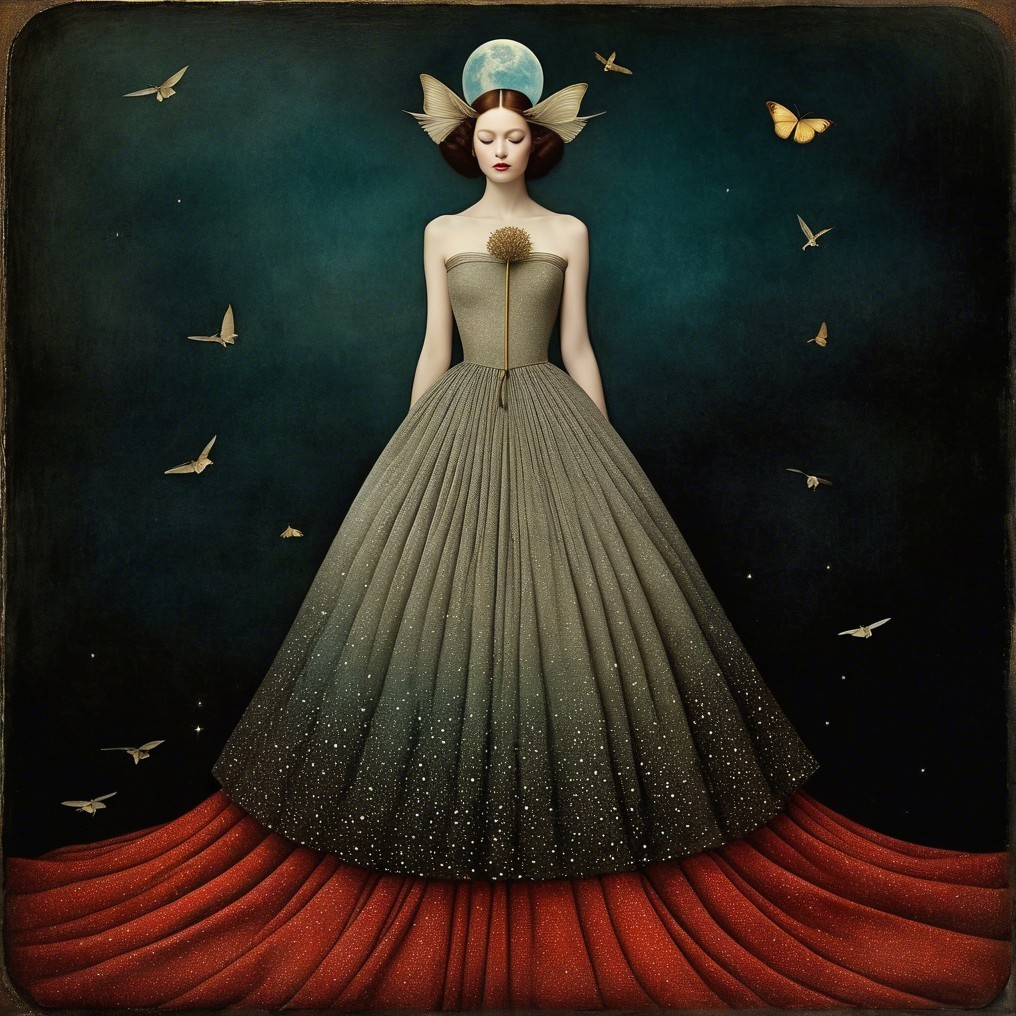 A surreal figure in a gown that transitions from dark to light, surrounded by butterflies and birds. A moon glows above, enhancing the dreamlike atmosphere of the scene.