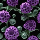 A surreal landscape featuring vibrant, stylized trees with fluffy, purple and pink foliage, set against a dark sky filled with glowing moons and soft hills dotted with stars.