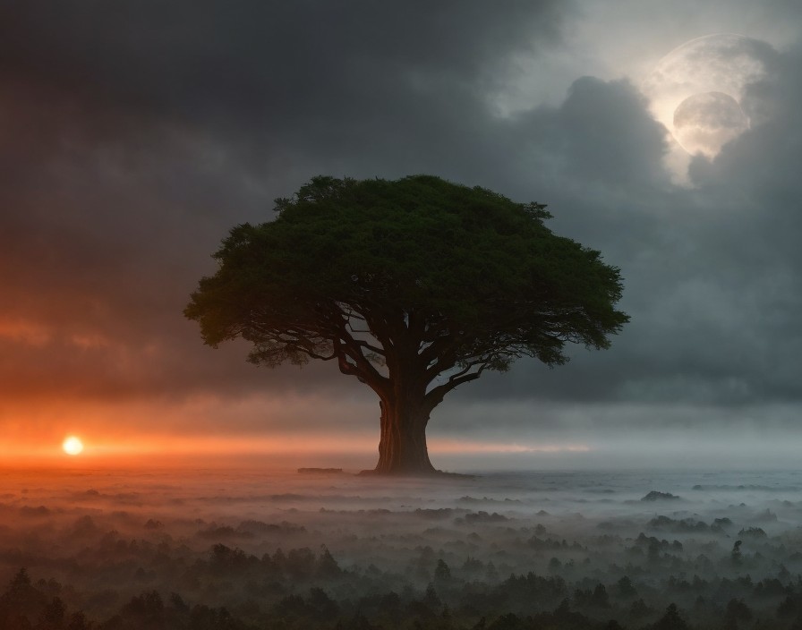 (Try it from richard a galvani) - A solitary tree stands above misty terrain beneath a moody sky with a visible moon and a warm, setting sun.