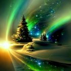 A breathtaking landscape featuring majestic mountains, a starry sky, and vibrant auroras illuminating the horizon. Snow-covered trees add to the serene beauty of this winter scene.