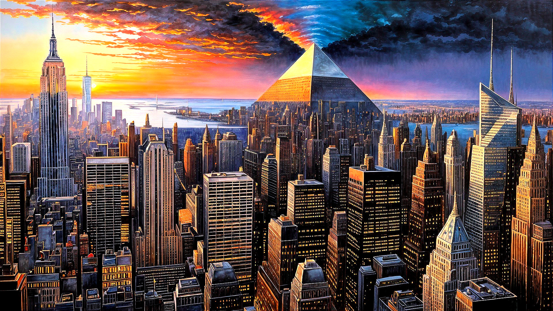 A stunning cityscape merges iconic skyscrapers with a massive pyramid under a dramatic sunset. The contrasting structures create a surreal atmosphere, blending modernity with ancient mystique.