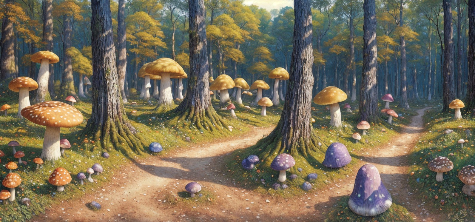 Prompt: forest with trees, treeroots and wonderful colorful rocks and glowing mushroom, psychedelic synthism, spectral colors, eyes in shadows, by Tomasz Alen Kopera, Dariusz Zawadzki, Gustav Klimt and Picasso.