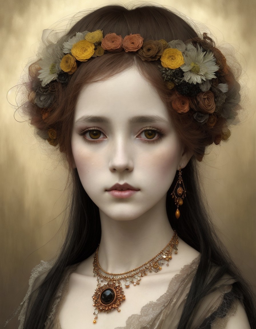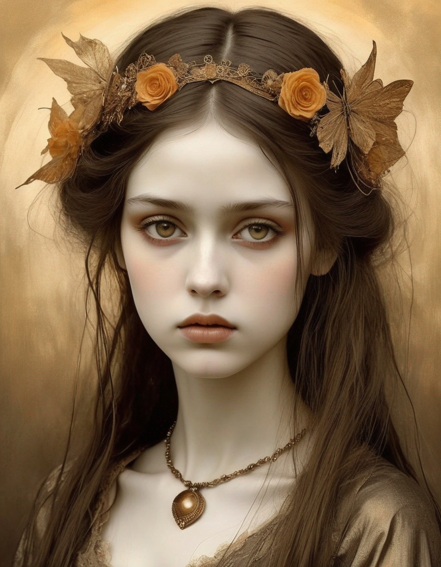A fantasy portrait of a young woman with striking eyes, adorned with a brown leafy headband and a subtle butterfly.