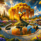 A serene landscape features a vibrant Japanese garden with a colorful willow tree, blooming flowers, and a traditional building, all set against the majestic backdrop of Mount Fuji.