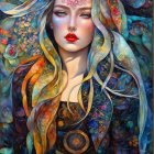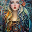 A vibrant portrait of a young woman with long, flowing hair in shades of blue and gold. Her serene expression is adorned with colorful flowers against a backdrop of swirling patterns and circles.