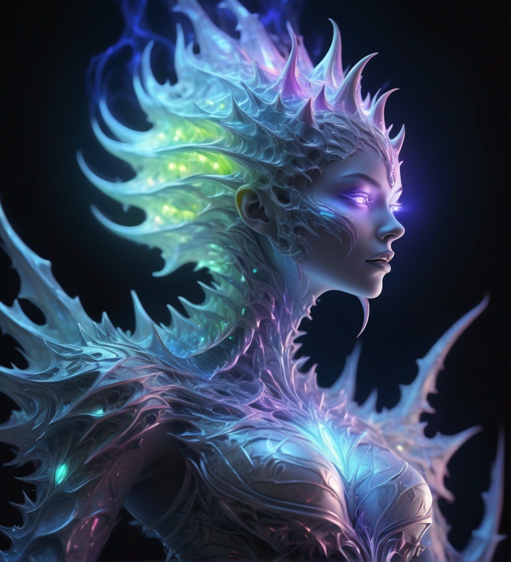 a beautiful ghost female entity, fantasy art, ethereal spiked form, beautiful, neural flame, fractal paralleled universe fantasy creature, realistic fantasy, neon uplight, in the style of NubisImmortalAiCreations