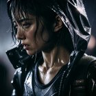 A close-up portrait of a young woman with wet, tousled hair and intense eyes, wearing a glossy black jacket. The background features a muted urban setting with blurred lights and rain.