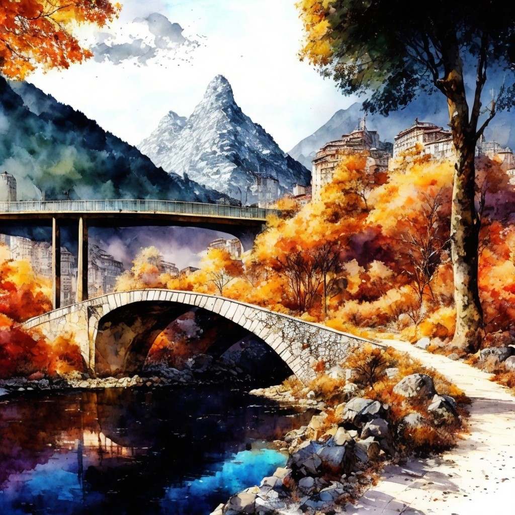 Scenic stone bridge over river with autumn trees and snowy mountains