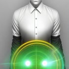A bald man in a suit stands with outstretched hands, surrounded by vibrant flowers. He gazes at a glowing, radiant orb, symbolizing energy and enlightenment against a colorful backdrop.