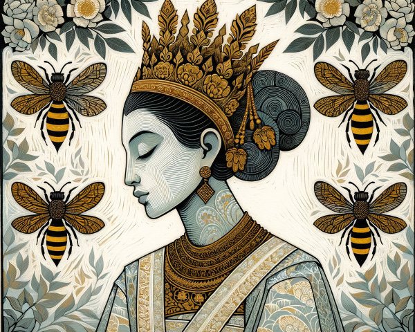 An intricate illustration of five stylized foxes with vivid colors surrounded by a detailed pattern of leaves and swirls.