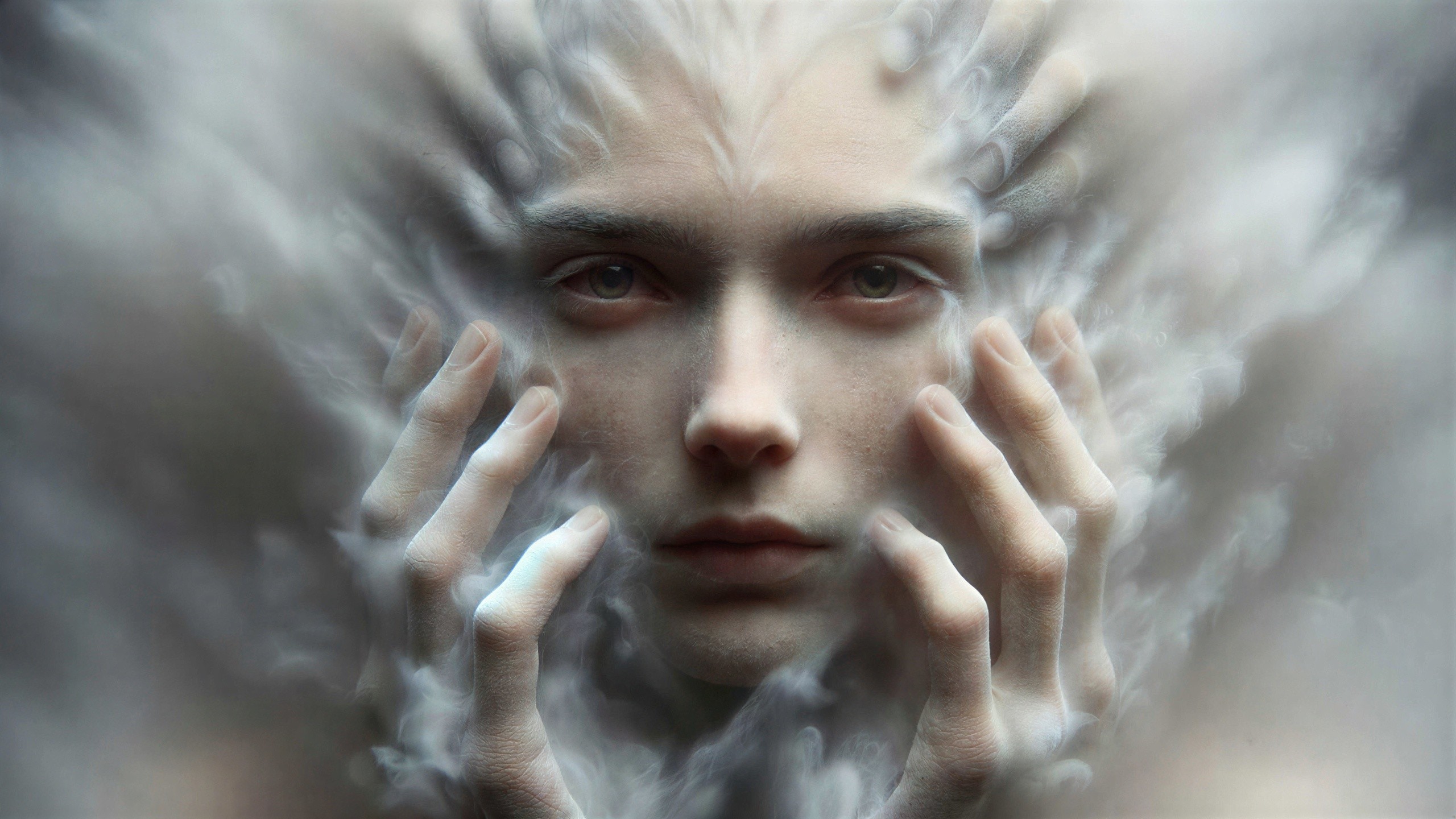Prompt: Portrait d'une figure androgynique au Nom Premier, capturant l'instant précis où son Visage et ses Mains émergent de la Brume d'un Champ de Transition . La texture est un amalgame harmonieux de matière et d'éther, là où le Vide et le Plein fusionnent. La Brume forme une structure pyramidale subtile, à la fois opaque et luminescente, traduisant le Tout-Possible non encore articulé. Éclairage doux, qualité photographique, hyper-détaillé, style fusion éthérée, neutralité chromatique