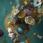 A fantastical scene featuring whimsical characters, including elegantly dressed figures atop a large, graceful creature amidst ornate decorations, flowers, and playful rabbits in a magical setting.