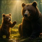 A playful bear cub waves in a sunlit forest, while a larger bear relaxes nearby. The scene is vibrant with green foliage and warm light, capturing the charm of nature's wildlife.