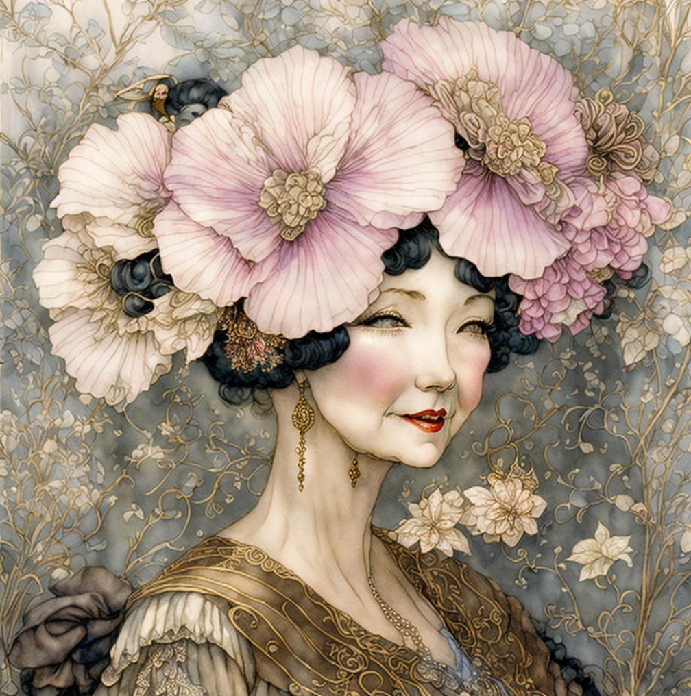 A whimsical illustration of an elderly woman adorned with large pink flowers in her hair, surrounded by delicate blooms and glowing lights, exuding charm and a touch of enchantment.