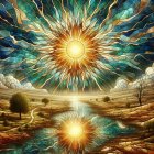 A surreal landscape rendered in the style of a stained-glass mosaic. A glowing golden sun bursts through a dramatic sky of cracked turquoise and blue patterns, its light radiating in branching, lightning-like forms. Below, a calm pond mirrors the sun and sky perfectly, creating a symmetrical reflection. The foreground shows earthy, textured fields with winding paths and scattered vegetation, while a lone tree stands to the left, its branches silhouetted against the luminous sky. The scene feels both cosmic and grounded, blending natural realism with mystical artistry.