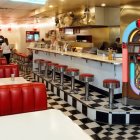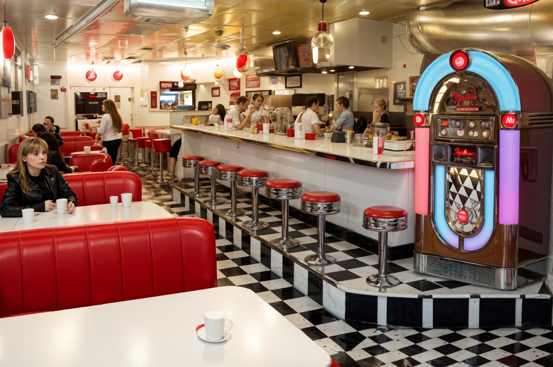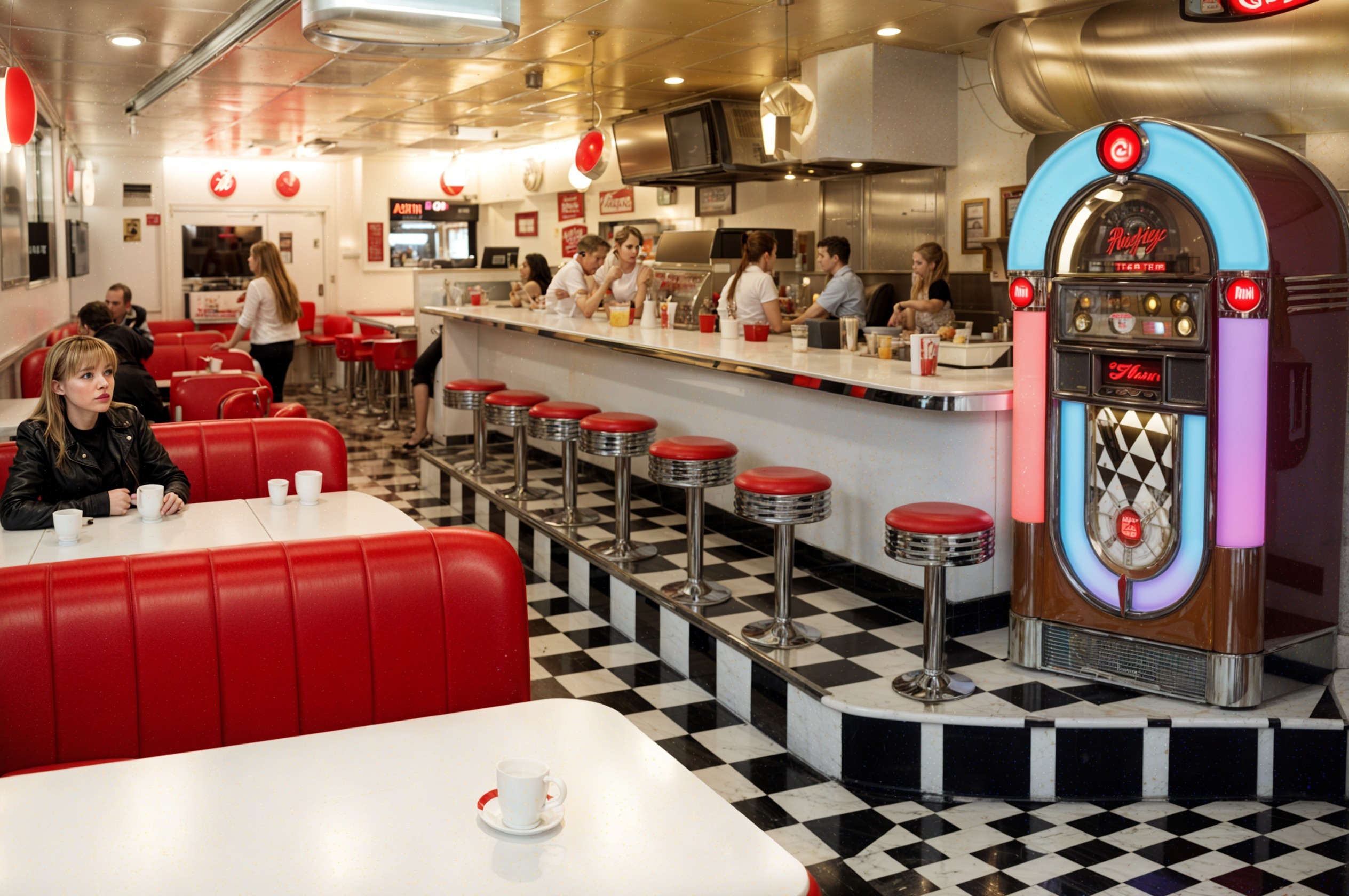A retro diner scene features red leather booths and shiny chrome accents. A jukebox glows brightly, while staff serve at the counter. A lone patron sits with coffee, enjoying the nostalgic atmosphere.