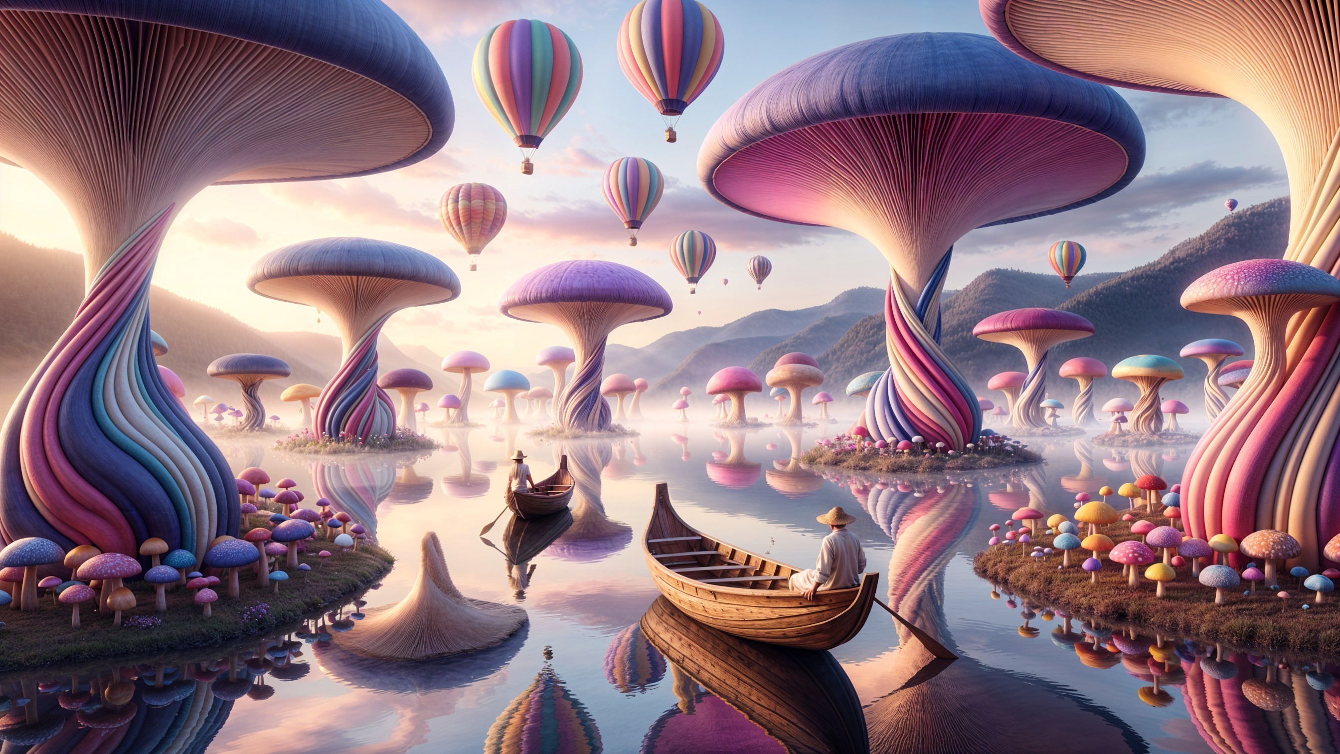 A vibrant landscape features giant, colorful mushrooms and floating hot air balloons above a serene lake. Two boats glide through the mist, surrounded by whimsical, fantastical flora.