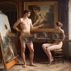 In a sunlit artist's studio, a male model stands beside a canvas depicting a seated woman. She, dressed casually, observes him while holding flowers, creating a blend of art and reality. Censored again.