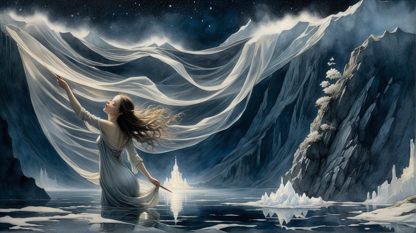 A delicate fairy girl with silvery hair and a crown gazes thoughtfully over a serene lake, surrounded by ethereal wings and a mystical castle set against a starry sky.