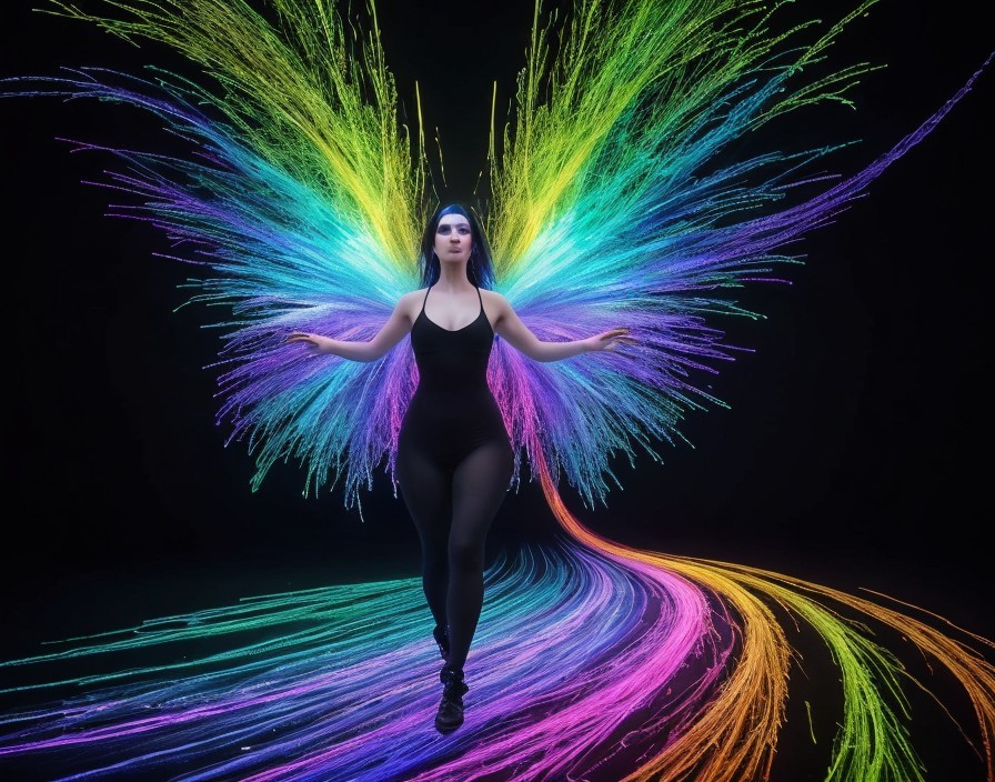 A full body shot of a woman with black hair and bangs, in a black strappy camisole, black leather pants, and black boots. She wears sheer pink opera gloves, and black fingerless gloves. She stands in the center of the image, emerging from a chaotic burst of color.