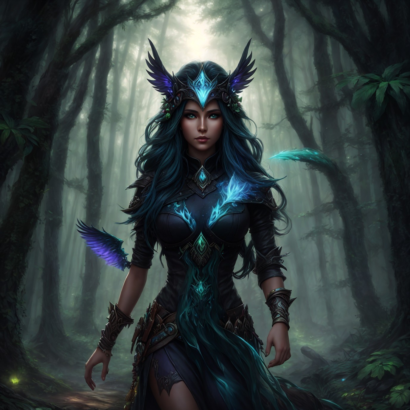 Mystical forest with ethereal woman and blue butterflies