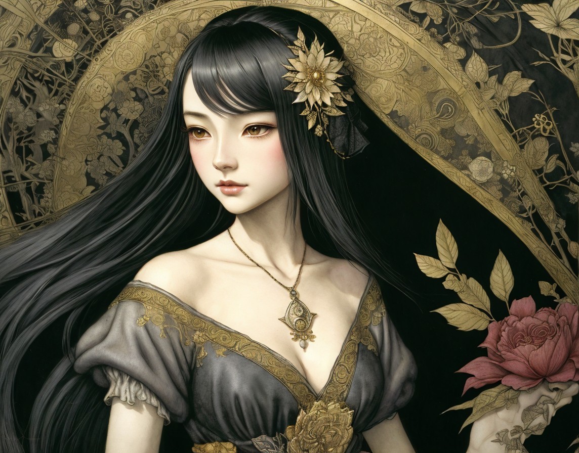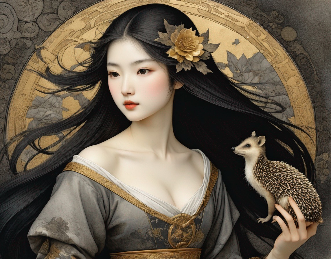 Legend of the Girl and the hedgehog, Medieval Japanese Artists Sumi-e Style, Velvet Black, Shabby, Dull Gold, Amber Gray, Golden Ratio, Surreal Fantasy, Elegant, High Definition Ultra Fine 3D Line, Zenangle Style, Watercolor Patchwork , Arthur Rackham Style, Paul Kidby, Gediminas Prankevicius, Jacek Jerka, Extremely Detailed, Intricate, Thoughtful, HDR, Fractal, Beautiful, Award Winning, Fantasy Look, Fantasy, Crisp Quality