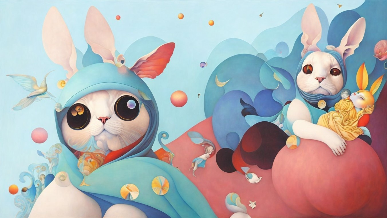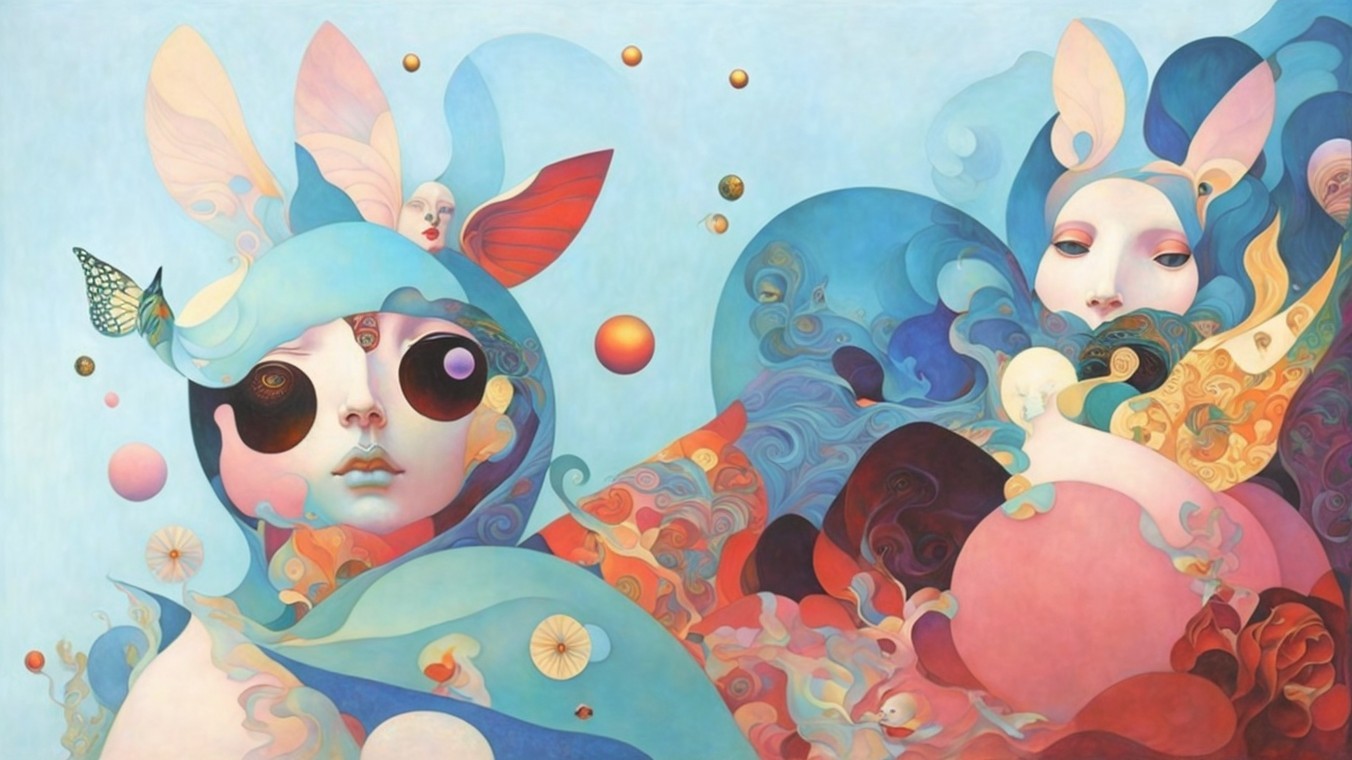 A fantastical scene featuring a graceful figure in a flowing gown, adorned with intricate patterns. Surrounding her are vibrant pink flowers and a serene, enchanted water landscape.