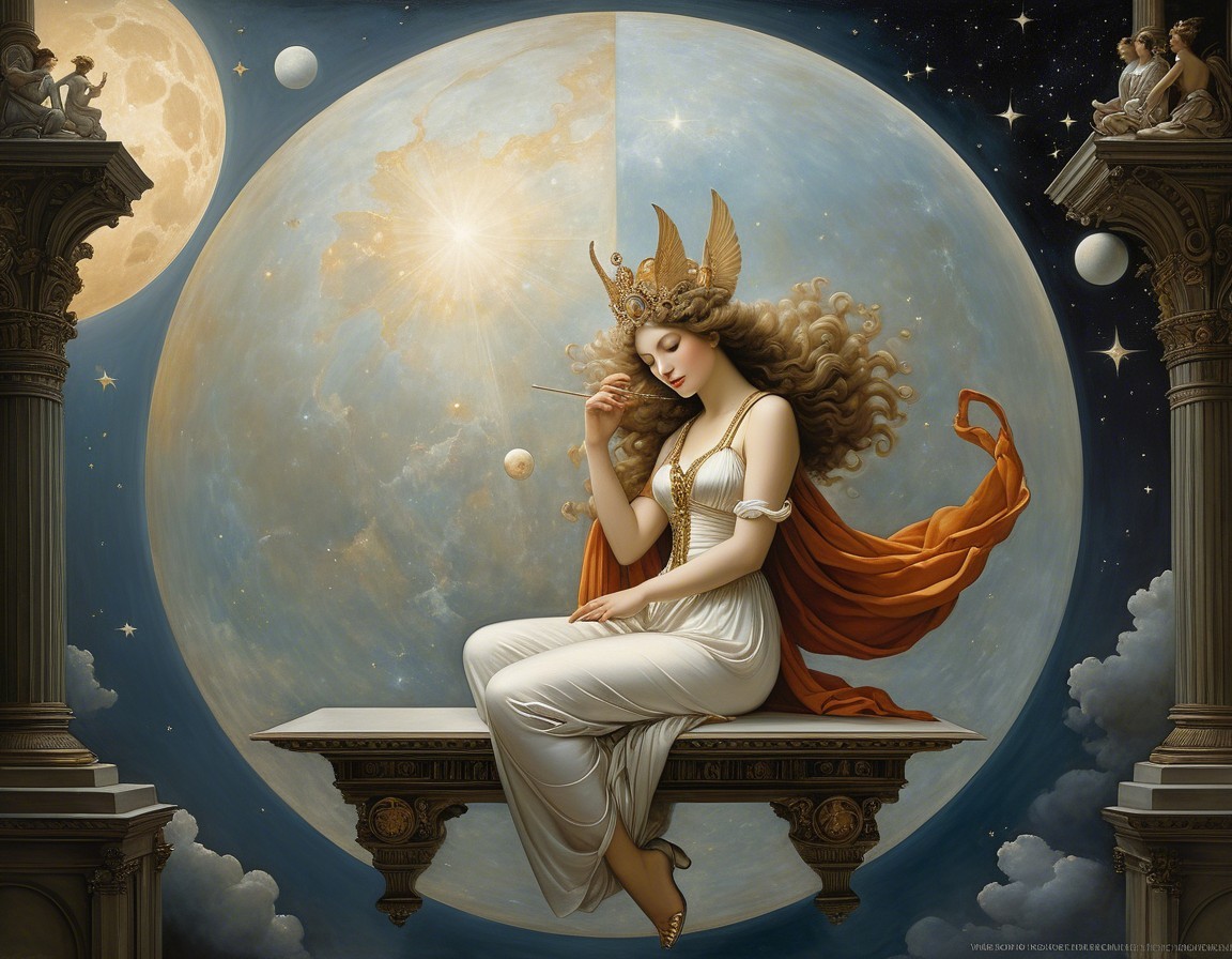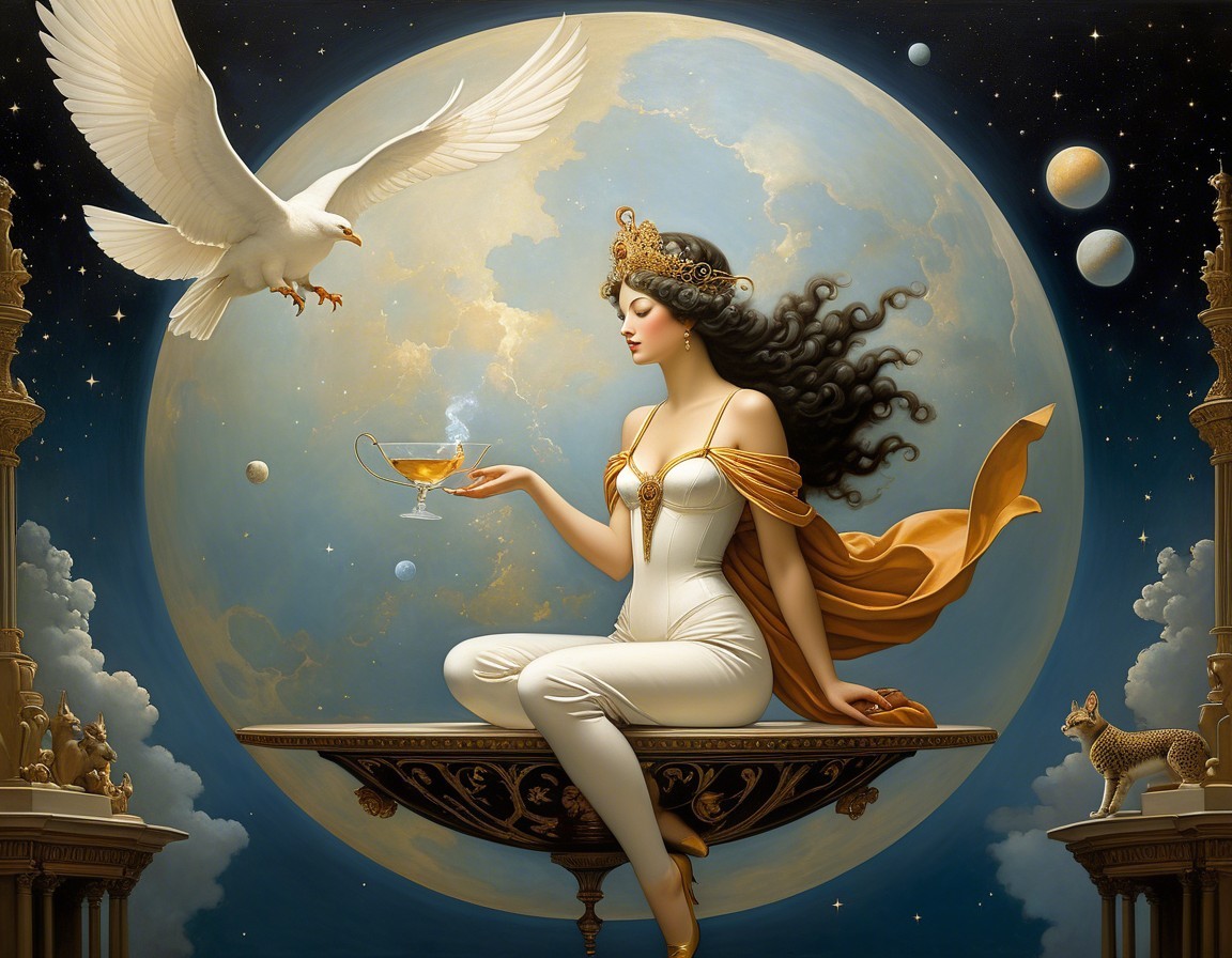 A serene woman in a flowing white gown sits on a crescent moon, reaching out to a majestic eagle. Ethereal figures and a luminous moon create a mystical, enchanting atmosphere.