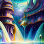 A surreal landscape features majestic towers with intricate designs, cascading waterfalls, and vibrant colors. Floating ships navigate a mystical sea under a starry sky, creating a dreamlike atmosphere.